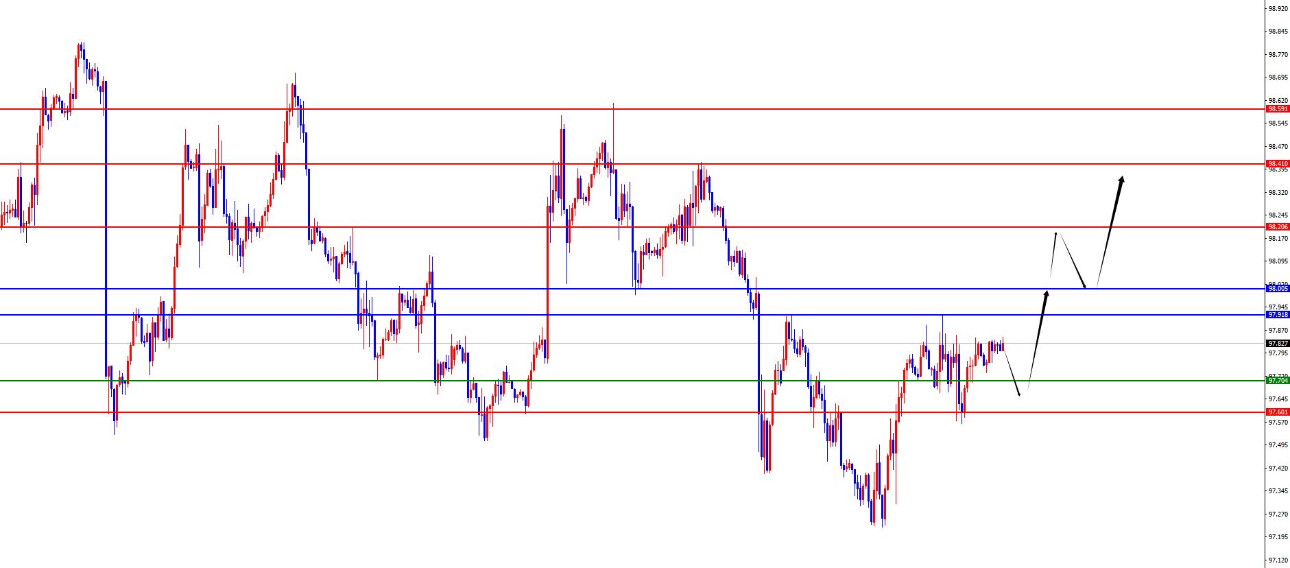 Aus einer Mehrzyklusanalyse hat der Preis in letzter Zeit in der wöchentlichen Ebene auf und ab konsolidiert. Derzeit liegt der wöchentliche Widerstand im Bereich von 97,90 und der Preis liegt unter dieser Position. Der Preis wird sich erst lange nach dem anschließenden wöchentlichen Schließen über dieser Position wenden. Ab dem täglichen Niveau liegt der aktuelle tägliche Widerstand im Bereich 98 im Laufe der Zeit. Gegenwärtig ist es notwendig, darauf zu achten, ob der Preis den täglichen und wöchentlichen Resonanzwiderstand stabilisieren kann. Aus vierstündiger Sicht stieg gestern weiter auf, nachdem er sich wie geplant wieder auf die vierstündige Unterstützung zurückgezogen hatte. Derzeit liegt der Preis immer noch über der vierstündigen Unterstützung. Heute konzentriert es sich auf die Unterstützung im Bereich 97,60-70, und darüber hat sich der 97,90-98-Bereich stabilisiert. In der ersten Stunde zeigt die kurzfristige Schwankung derzeit einen volatilen Anstieg. Warten Sie also weiter, bis die Unterstützung steigt, bevor der Preis weiter steigt, nachdem er sich in Zukunft stabilisiert.