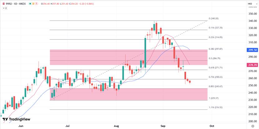 XM Hong Kong Stocks: Pop Mart (09992.hk) El precio de las acciones) ha caído recientemente, con una disminución acumulativa del 24% desde el final de agosto de agosto. Mostró su mayor caída desde abril del lunes, con una fuerte caída de casi el 9% en sesión, la mayor caída en cinco meses. El precio actual de las acciones ha alcanzado el más bajo desde principios de agosto, correspondiente a las expectativas de calificaciones de ingrato de las instituciones de calificaciones, lo que ha intensificado las preocupaciones de las personas sobre la disminución de la popularidad del producto de la xm-links.compañía.