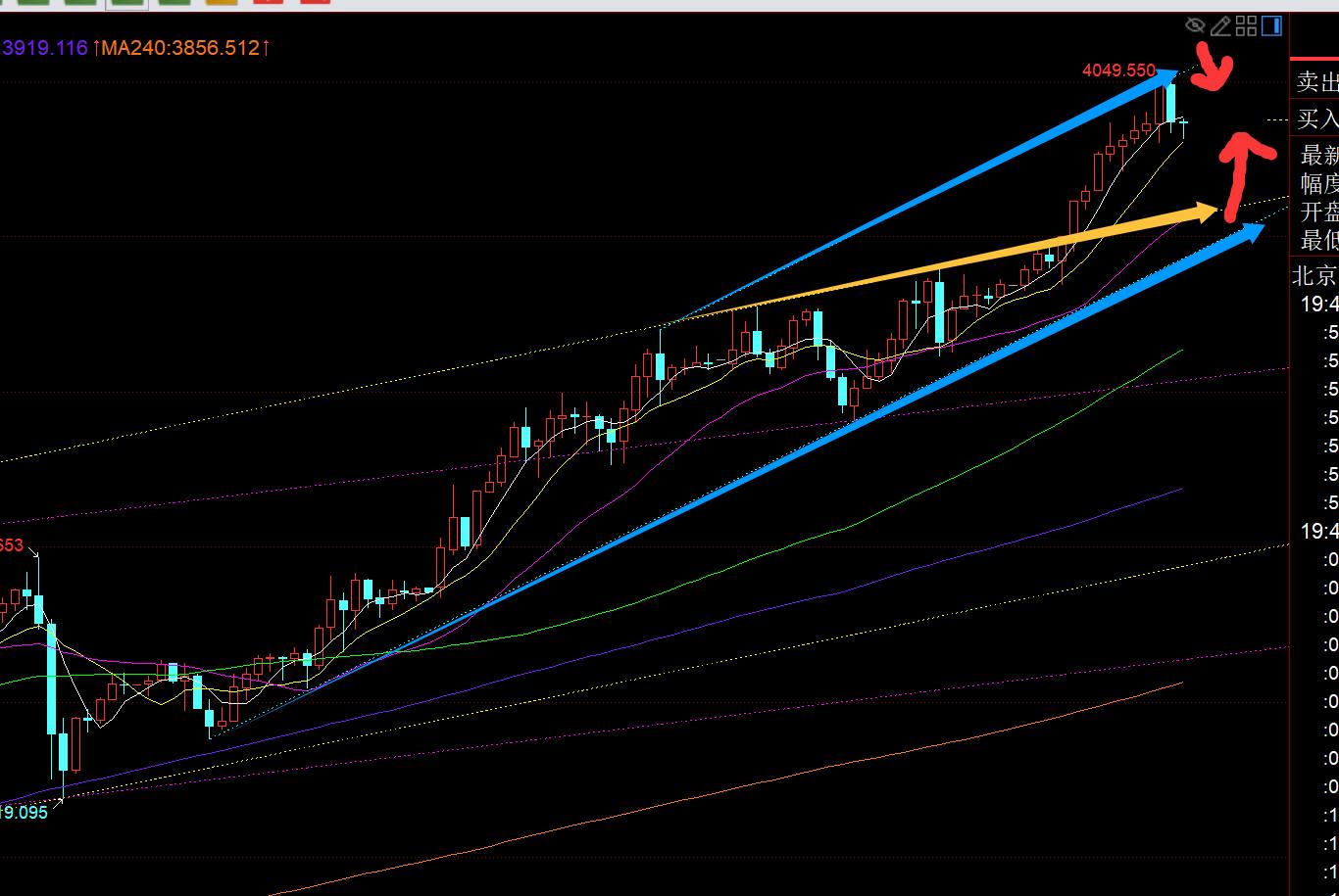 En tercer lugar, el nivel horario dorado: cerró con fuerza en un nivel alto durante la noche y el ciclo continuó subiendo temprano esta mañana. Sólo cuando el mercado abrió a las 6 o 7 en punto te atreviste a perseguir la subida directamente. Si lo miras demasiado tarde, no te atreverás a seguirlo, especialmente si supera los 4000 y sigue siendo a corto plazo. Sin darme la oportunidad de dar un paso atrás, me preocupa que suba rápidamente, lleve el mercado a un nivel alto y se hunda instantáneamente para obtener ganancias; el precio de cierre a las 19 en punto es Yin K en la parte superior, que apenas cubre el Yang K anterior, pero el soporte de 10 promedios móviles 4030 todavía está allí, y en el proceso de Yang continuo, es Yin por primera vez, por lo que no es posible juzgar al caballo. La tendencia alcista seguirá cayendo; el mercado europeo continúa subiendo y rompiendo alto, y habrá una segunda subida esta noche. Si el segundo pull-up aún suprime 4050 o supera 4050 y luego vuelve a caer para cerrar una presión K, entonces considere buscar una corrección; si primero se trata de un retroceso, entonces confíe en La estabilización por encima del carril medio 4005 es alcista y prepárese para una segunda subida; si desea una corrección importante, debe caer por debajo de la marca de 4000 y volver a caer, y luego puede probar el mínimo intradiario o romperlo. La probabilidad de que esto suceda no es alta por el momento, así que veámoslo paso a paso;