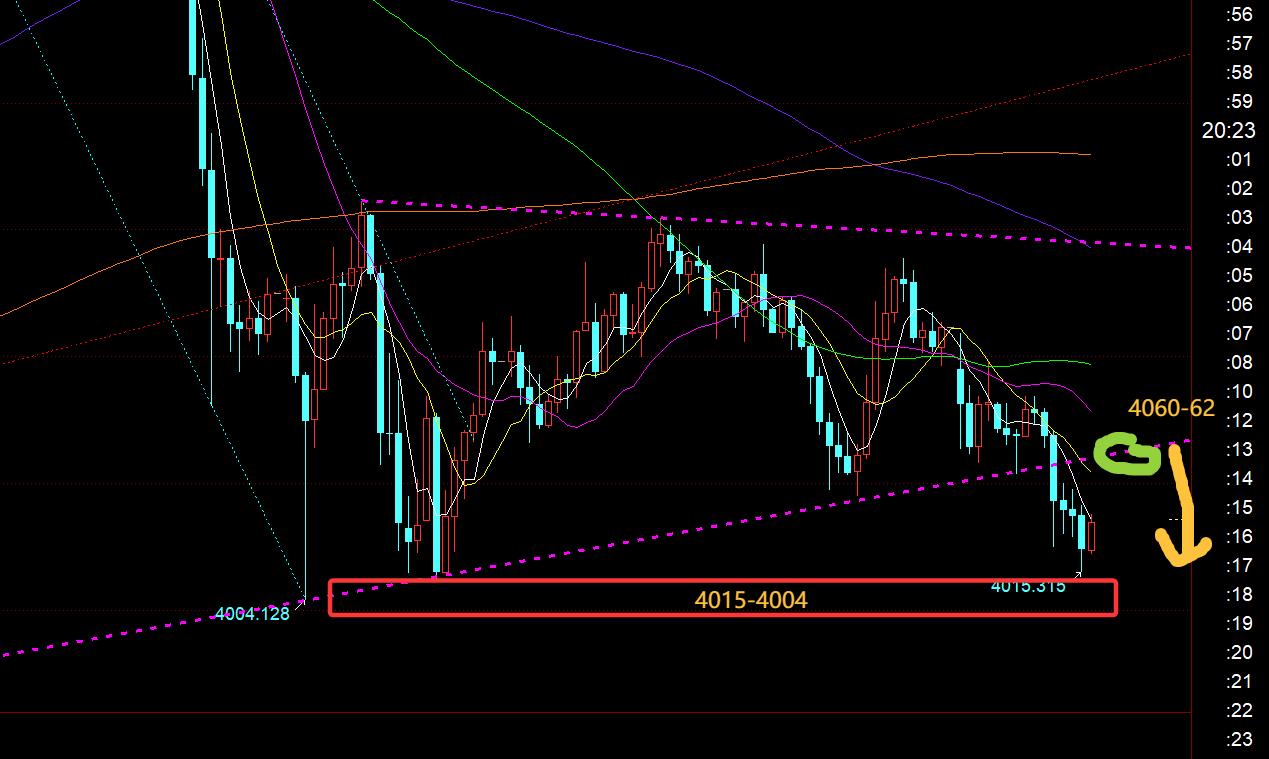 Cuarto, el nivel horario dorado: en la imagen de arriba, el triángulo de convergencia inferior se ha roto continuamente durante el mercado europeo hoy. Luego habrá un rebote antes y después del mercado estadounidense, lo que es fácil de atraer a los alcistas. Hay una segunda tendencia a la baja. Preste atención al punto de contrapresión del canal 4060, que se encuentra bajo presión a corto plazo. Bajista, el soporte inferior es 4015 y 4004. Si se pierde la marca de 4000, preste atención a 3975, 3945 y el límite es 3914. Personalmente, creo que el espacio inferior no es grande o el tiempo no es duradero. Estará abajo en 2 horas y 4 horas. Desde el punto de vista estatal, es fácil sorprender el rebote de sobreventa tirando hacia abajo; por lo tanto, trate de no perseguir la caída antes de que se produzca el rebote; Además, si el precio supera 4060 y vuelve a subir y regresa al triángulo de convergencia, expandirá el rango de convergencia y continuará consolidándose, o se estabilizará lentamente y subirá. No se puede ser ciegamente bajista; por lo tanto, si va a ser bajista por segunda vez esta noche, el precio de cierre no debe volver a caer dentro del triángulo morado del gráfico. Si desea ser alcista en un nivel bajo, debe esperar hasta que se xm-links.complete la segunda caída o haya señales estables cerca de los soportes mencionados antes de considerar;
