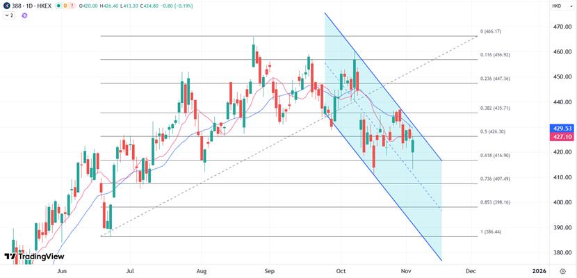 Desde una perspectiva de valoración, el P/E actual de la Bolsa de Valores de Hong Kong es de entre 30 y 35 veces. Aunque está cerca de un máximo de un año, también es superior al promedio histórico (entre 25 y 30 veces), pero inferior al de las empresas tecnológicas de alto crecimiento. Las ganancias que superaron las expectativas pueden haber impulsado el precio de las acciones recientemente, pero que las valoraciones sean demasiado altas depende de la sostenibilidad del crecimiento futuro. Las valoraciones actuales descontan parcialmente el volumen récord de operaciones, pero no reflejan plenamente el potencial a largo plazo de las OPI y los derivados. Después del desempeño de hoy, el precio de las acciones siguió al mercado y se vio afectado. Sin embargo, en el corto plazo, el precio de las acciones seguirá digiriendo el desempeño positivo, pero si puede superar la resistencia del promedio móvil diario y regresar al tope del rango desde mediados de octubre, la resistencia clave para regresar al rango alto es 440 dólares de Hong Kong.