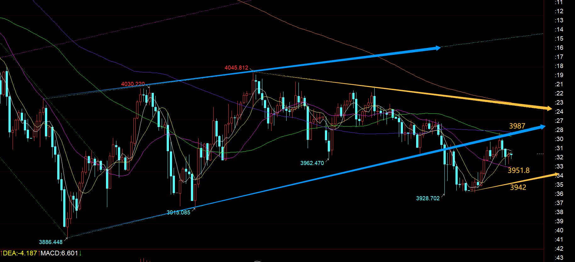 En segundo lugar, el nivel dorado de 4 horas: la resistencia del carril medio baja a 3987, que resulta ser el punto más alto a esta hora del día, y el soporte promedio anual sube a la línea de 3930, y el rango operativo de esta noche probablemente esté dentro de este rango;