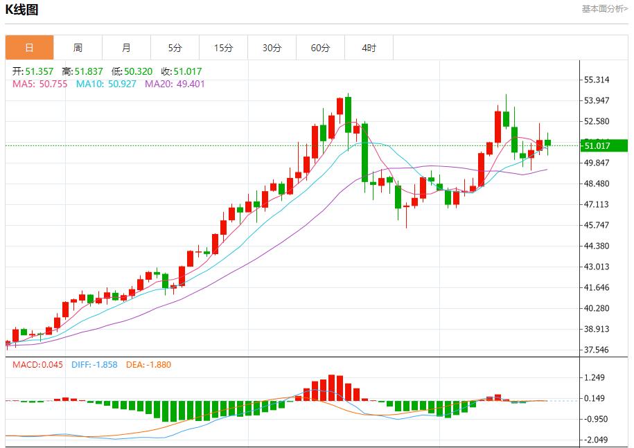现货白银:截止北京时间21:20,现货白银下跌,现报51.019,跌幅0.62%。纽市盘前,(白银)价格在最后一个交易日下跌,在达到超买水平后,相对强度指标出现负面信号,超过了其EMA50的支撑,这使其处于负面压力下,阻碍了未来一段时间的复苏尝试,主要看涨趋势占主导地位,其交易伴随着该趋势的支撑性次要趋势线。