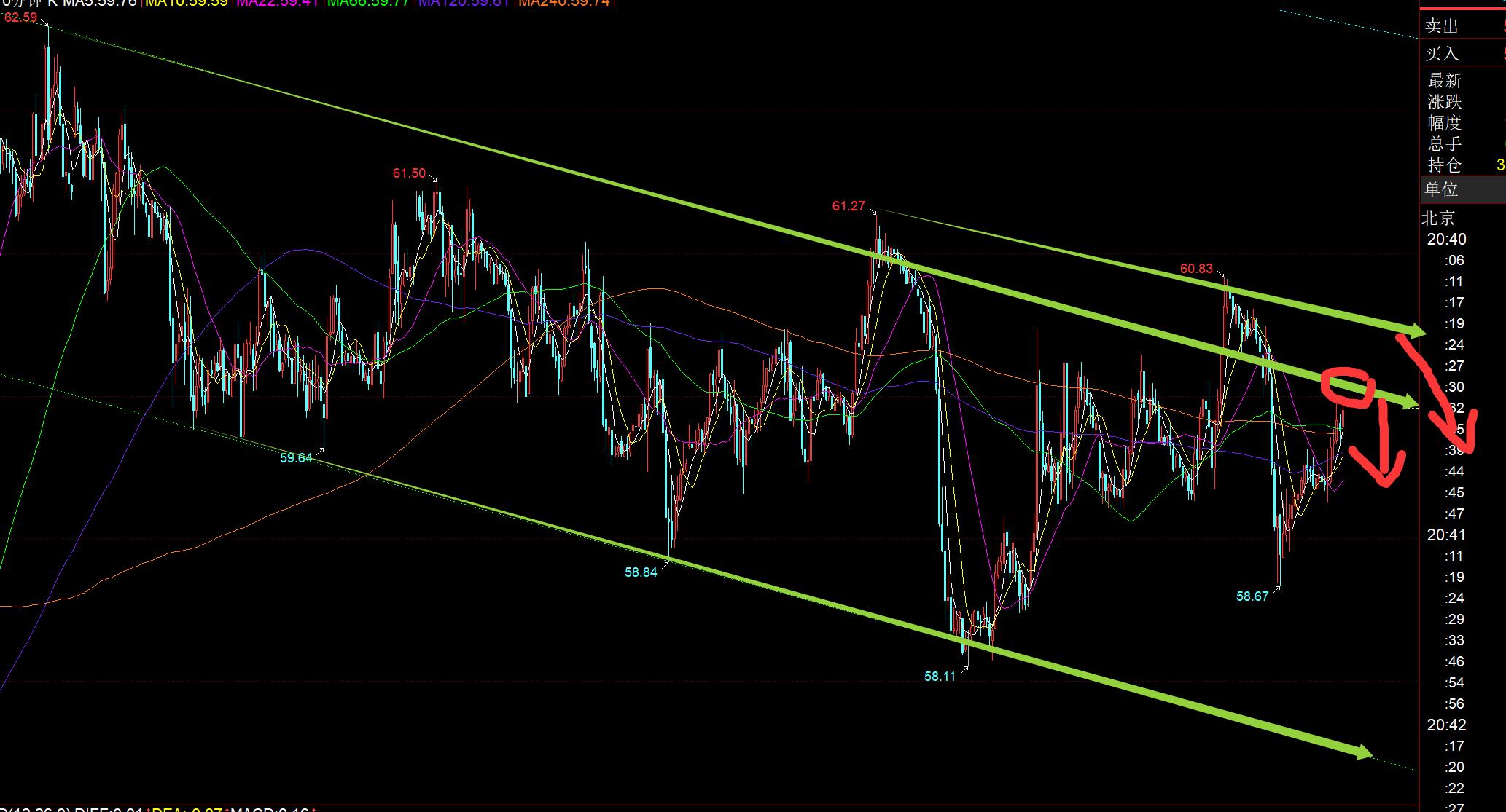 原油方面:仍是关注图中通道,两次上破通道上轨,但都没逗留太久而冲高打压回归至通道内,今晚关注60及上方的承压信号,继续看冲高回落;