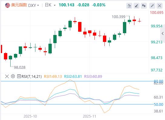 上周五,尽管美联储“三把手”鸽派发言令12月降息预期有所回暖,但美元指数维持坚挺,盘中创近6个月新高,截至目前,美元报价100.13。