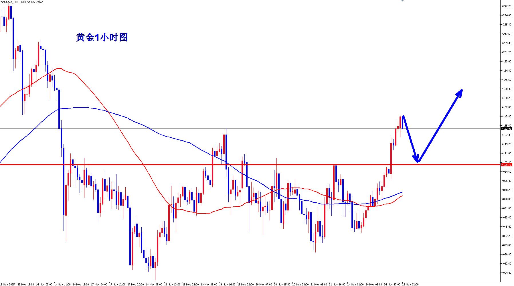黄金1小时最终向上突破,黄金多头在多种利多的因素加持下,黄金多头气势如虹,黄金短线多头继续强势,黄金突破4100一线并有效站稳,早盘回落4100上继续逢低做多,黄金多头还有望更上一层楼。