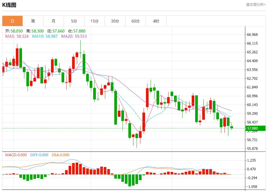 原油市场:截止北京时间21:20,美油下跌,现报57.880,跌幅0.10%。纽市盘前,受短期小幅看跌趋势测试的影响,(原油)价格在最后一次盘中交易中下跌,由于交易低于EMA50,其影响加剧。此外,相对强弱指标上出现负面叠加信号,表明价格在早盘交易中上涨动能迅速减弱。