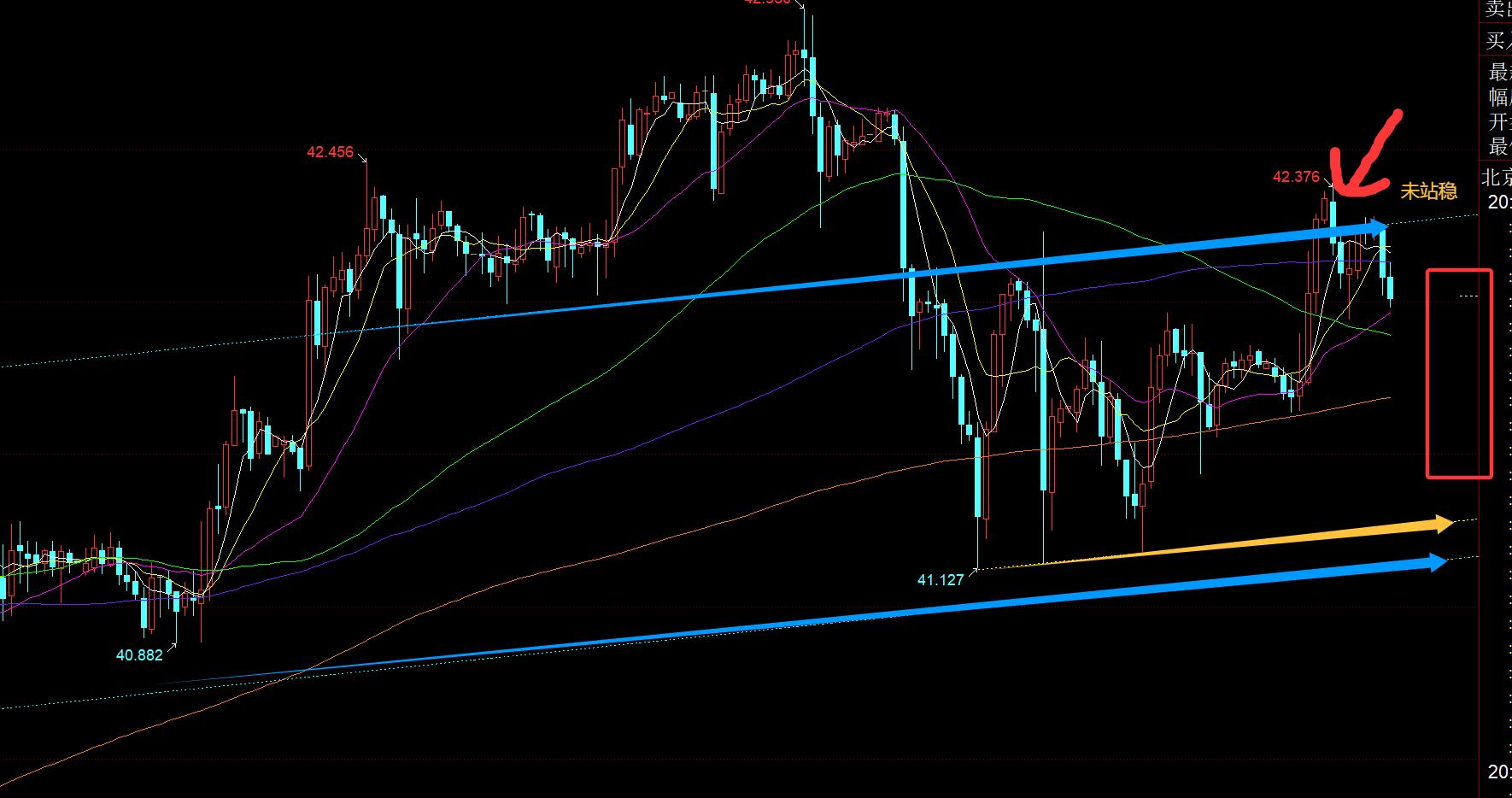 白銀方面:亞盤支撐41.6氣勢洶洶的一路連陽強攻,也的確突破了藍色通道上軌壓制點42.2,但只是刺破昨日高點,並未有效站上,歐盤又衝高回落,美盤前再次反彈仍壓制上軌42.2一線;因此,它也回歸了通道內震盪,那麼繼續留意42.2-41.1這個區間內運行,中軸支撐是41.7-41.6不變;