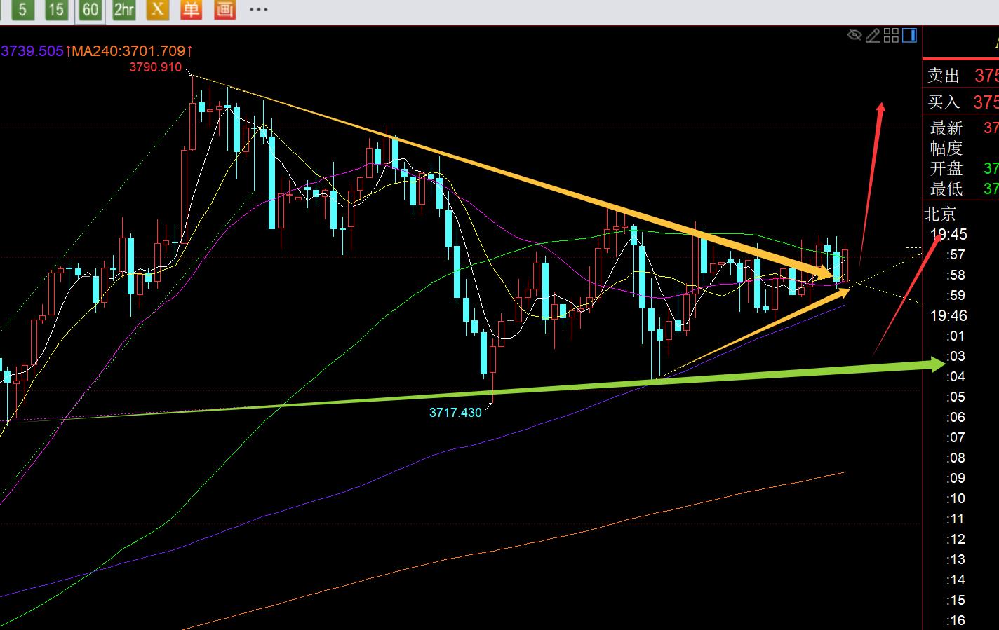第二,黃金4小時級別:此週期從當前發展來看,多次承壓中軌,今晚就是考驗它得失的時候;只要22點收報不錯的陽K,收盤站上中軌3754,則基本會延續強攻去刷歷史新高;